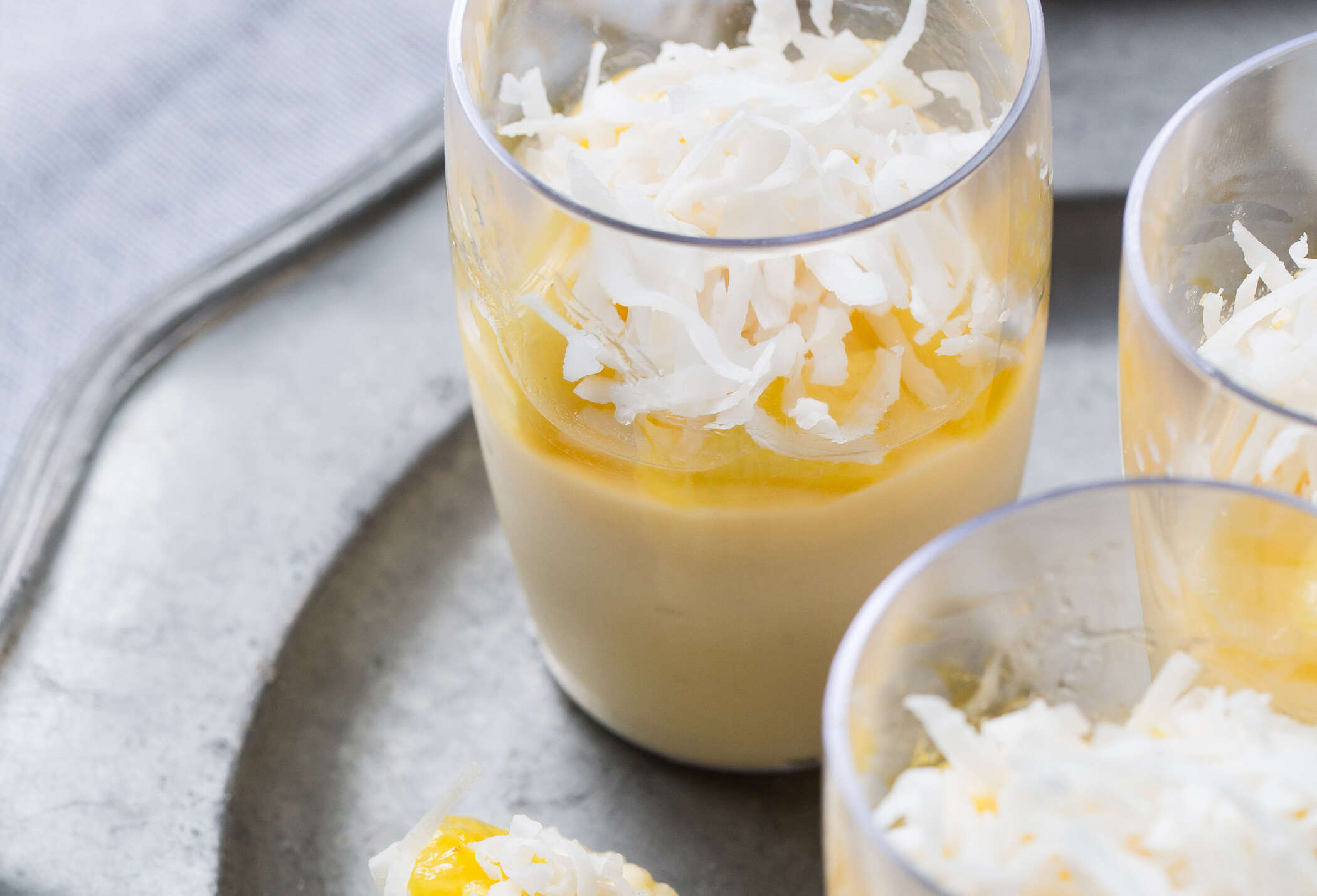 זהו קינוח בכוס על בסיס קרם קוקוס, חגיגי וטעים במיוחד. חשוב לציין שהקינוח הוא פרווה ומושלם לסיים בו ארוחה בשרית. טעם הקוקוס גם משתלב מצוין עם פירות טרופיים דוגמת מנגו או אננס. המתכון מתאים ל־10-8 כוסות בנפח של 140 מ"ל. דרגת קושי: קלה־בינונית.