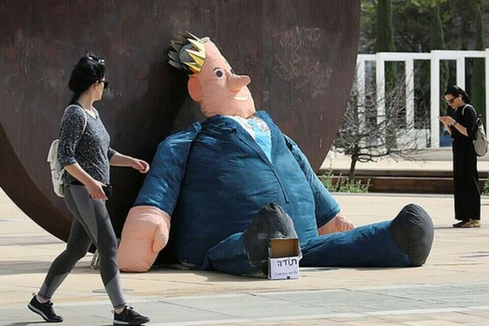 יומיים לפני הבחירות לכנסת ה-21 שייערכו בשלישי, מי שעבר בכיכר הבימה בתל אביב יכול היה לראות הבוקר (ראשון) בובת ענק של ראש הממשלה בנימין נתניהו