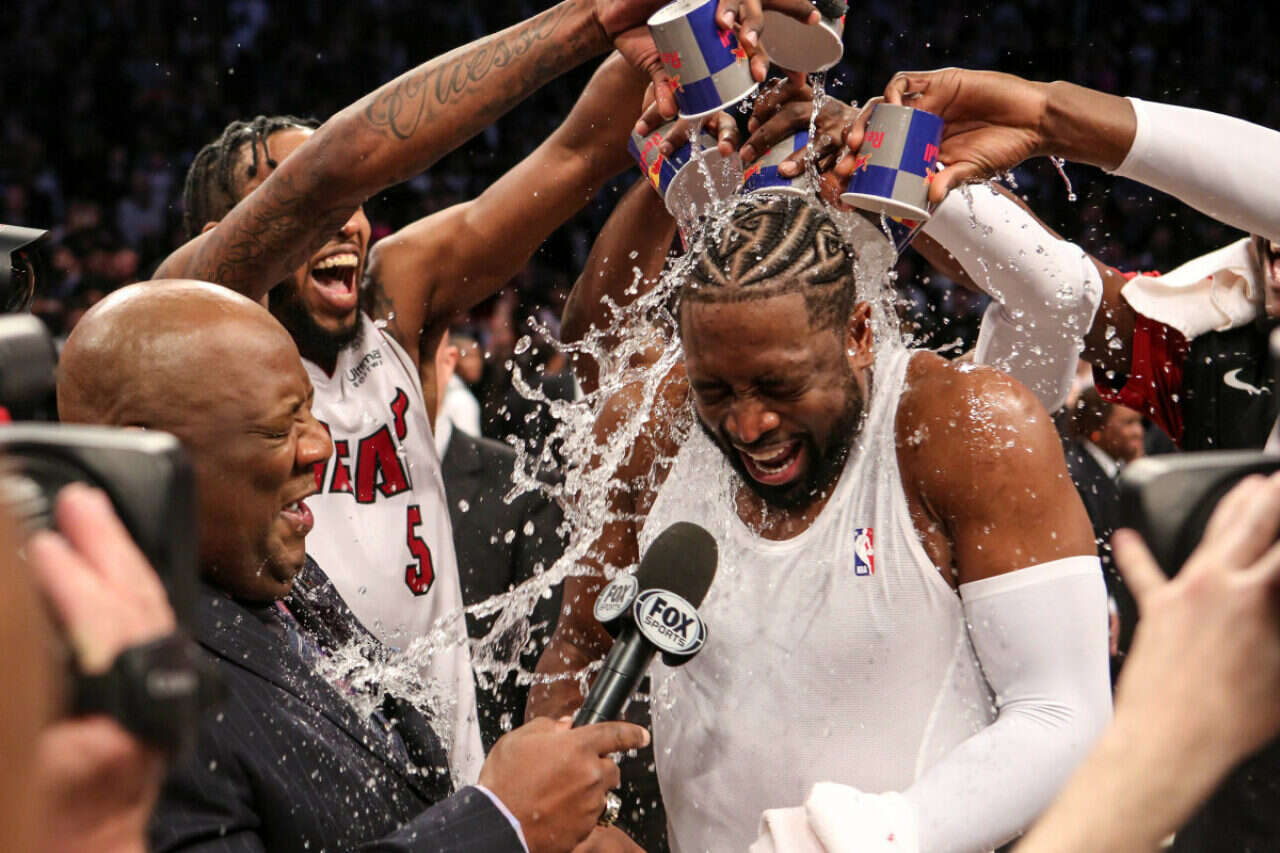 צילום: אי-אף-פי // דוויין ווייד מקבל את החיבוק האחרון. טריפל דאבל במשחק האחרון בקריירה