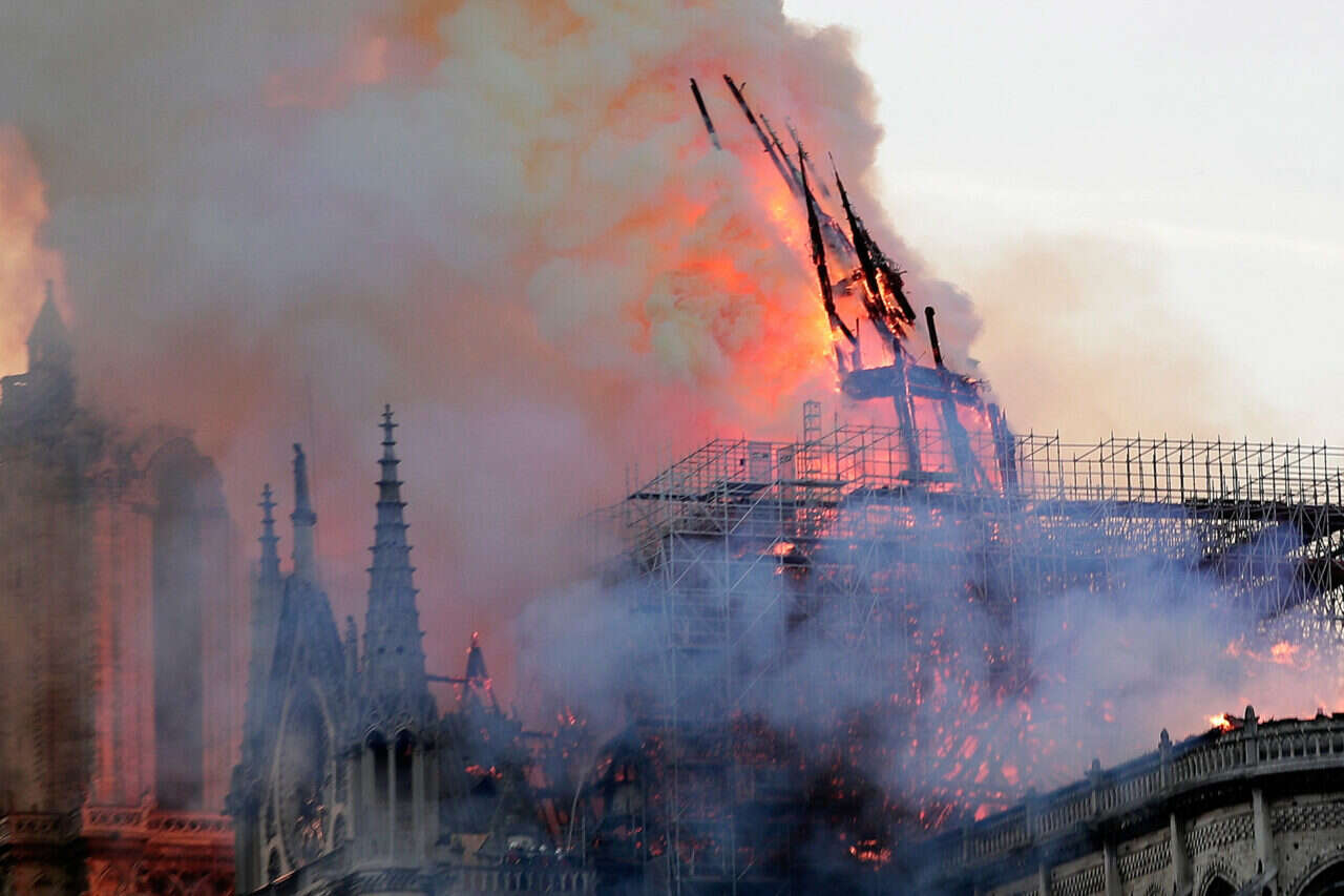 בסרטונים שצולמו על ידי עדי ראייה, נראה עשן שחור עולה מהמבנה בן 850 השנה, ולהבות אש גדולות מכלות את חלקה העליון של הקתדרלה הגותית סביב שני מגדלי הפעמון. לפי הדיווחים, אחד הצריחים התמוטט מהאש, וכן חלקים מתקרת המבנה.