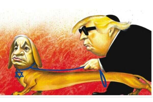 בקריקטורה הפוגענית מוצג ראש הממשלה בנימין נתניהו ככלב נחייה, שלצווארו תליון מגן דוד, המוביל את נשיא ארה"ב טראמפ, המתואר באיור כאדם עיוור חובש כיפה.
