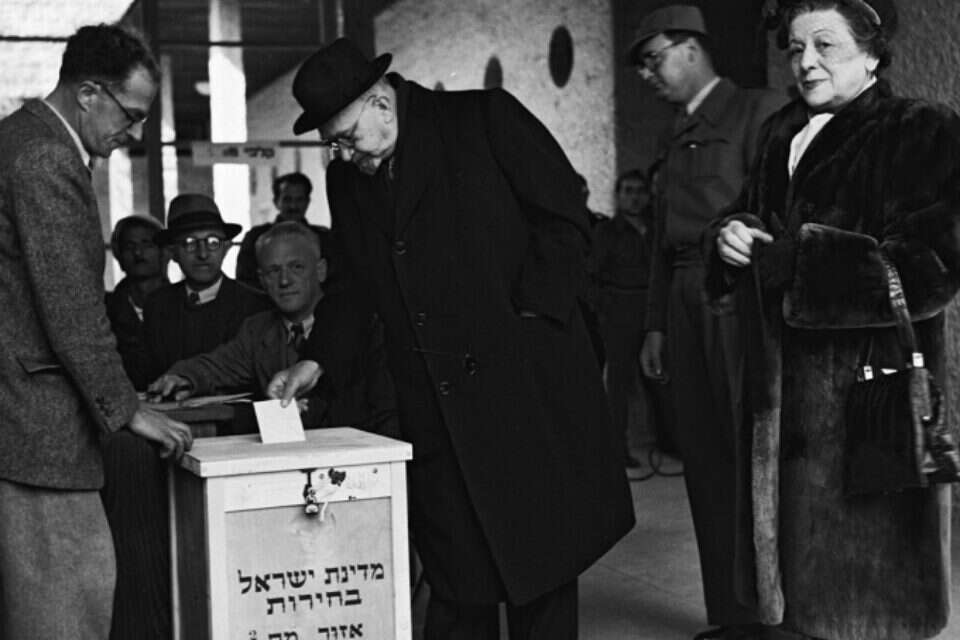 צילום: הוגו מנדלסון/לע"מ // 12:15, קלפי מספר 1 במכון לחקלאות ברחובות. נשיא המדינה חיים ויצמן מגיע עם רעייתו ורה, משלשל את מעטפתו לקלפי ומכריז: "מילאתי את חובתי האזרחית"