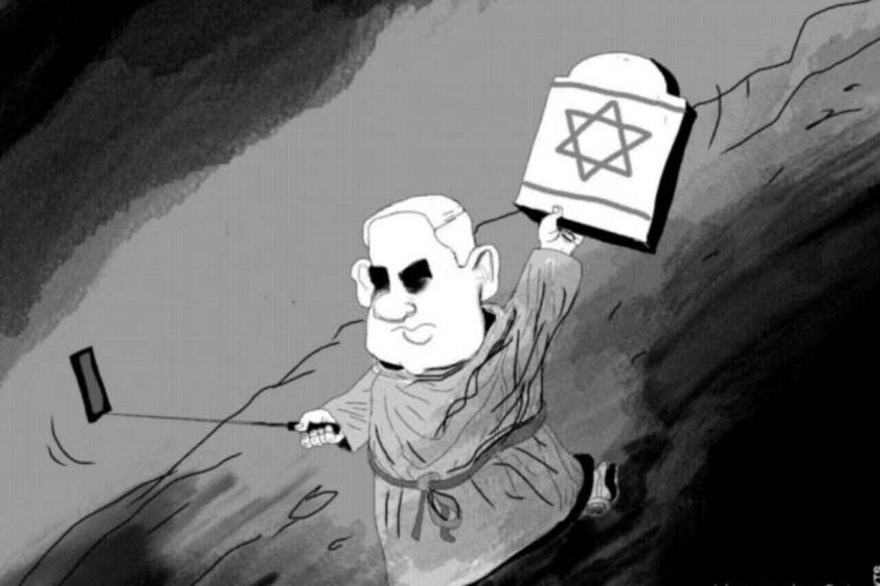 הפעם, לא מדובר בקריקטורה אנטישמית, אלא במשהו שנדמה למעמד הר סיני שכן ראש הממשלה נתניהו מחזיק את מה שנראה כלוחות הברית ועליהן מגן דוד, ובידו השנייה "מוט סלפי" אליו מחובר מכשיר סלולרי.