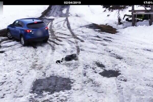 בסרטון רואים כלב צ'יוואווה קטן רץ בשלג, בעת שמכונית נעה לאחור במסלול כמעט בטוח לדרוס אותו. אלא שברגע זה רצה מהצד כלבת בורדר קולי מבוגרת, תופסת את הכלב הקטן ובמהירות מחלצת אותו לפני שגלגלי המכונית דורסים אותו.