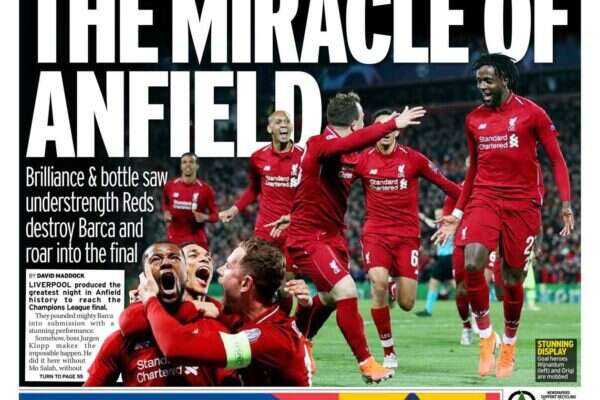ב”אייריש אקזמינר” נכתב “אגדות ליברפול הדיחו את ברצלונה בדרך לגמר ליגת האלופות” כאשר תמונה של כובש הצמד, ווינאלדום ולידו הקפטן הנדרסון קישטה את שער העיתון. ב"מטרו" נתנו דגש על כוחו של ה'קופ', כאשר על השער נראתה תמונה של שחקני ליברפול חוגגים.