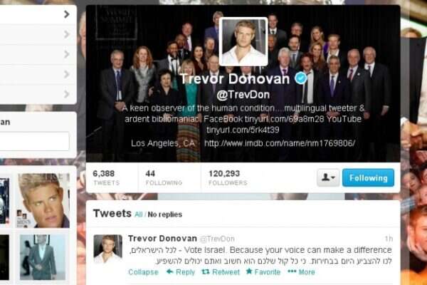 אחרי שסלבריטאי ישראל צייצו לכולם להצביע, מגיע תורם של סלבריטאי הוליווד. כוכב "90210", השחקן טרבור דונובן, צייץ בחשבון הטוויטר שלו המונה למעלה מ-100 אלף עוקבים את הציוץ הבא (לא נגענו): Vote Israel. Because your voice can make a difference - לכל הישראלים, לכו להצביע היום בבחירות. "כי כל קול שלכם הוא חשוב ואתם יכולים להשפיע".