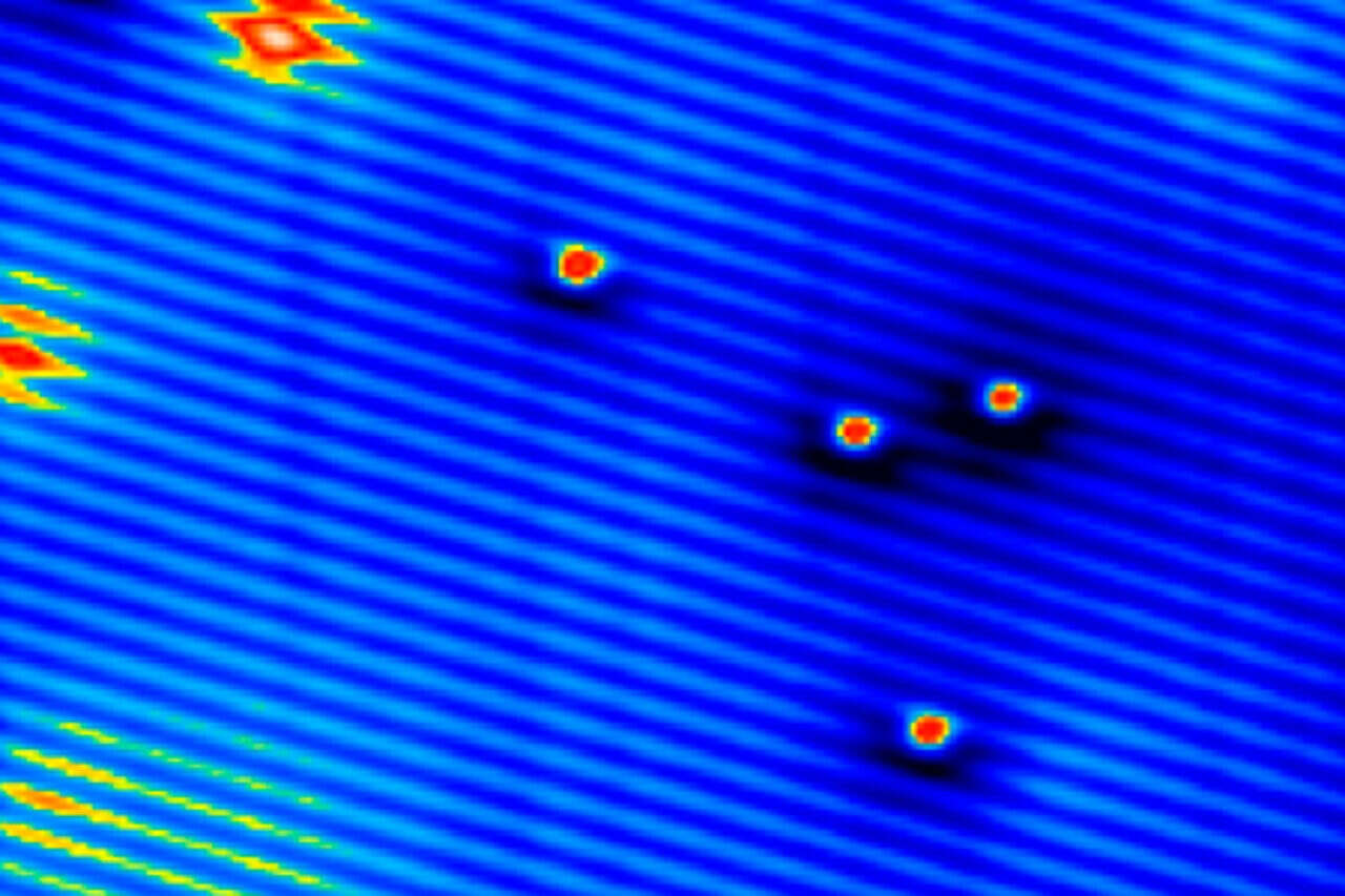 צילום (צבוע) במיקרוסקופ אלקטרונים המראה את הספינים של אטומי מנגן כענן אדום-צהוב // צילום: Science Photo Library