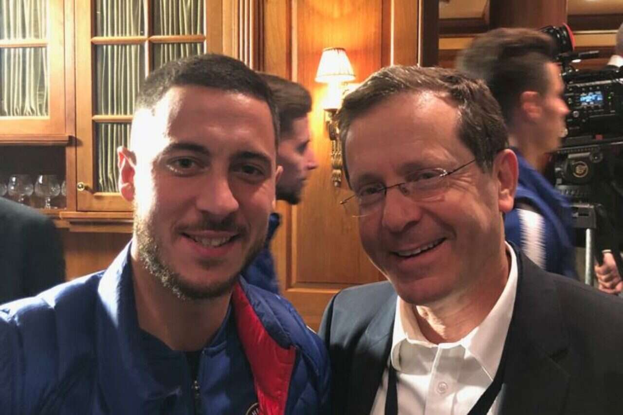 שחקני צ'לסי מקשיבים להרצוג. המועדון מתגייס למאבק באנטישמיות הגוברת בעולם // צילום: הסוכנות היהודית