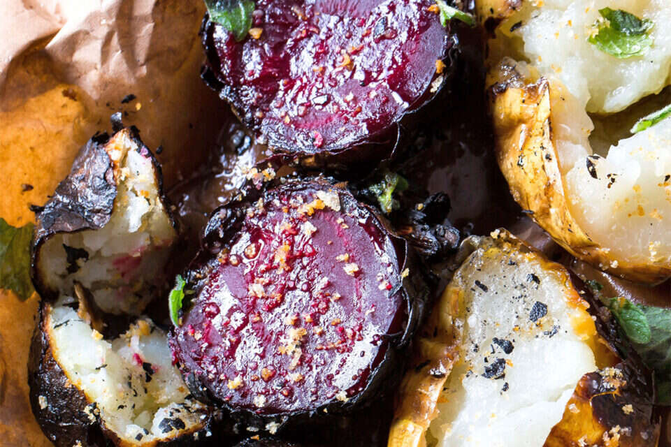 המנה מבוססת על סלק, על קולרבי ועל תפוח אדמה, כולם צלויים במדורה ומוגשים עם קרם פרש, עשבים ובוטרגו. אתם יכולים לקחת את הרעיון ולהביא אותו לעולמות הטעמים שלכם.