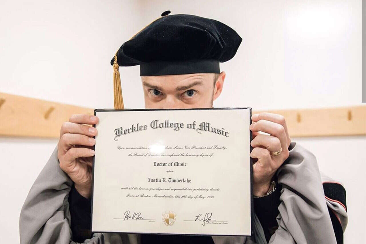 אוניברסיטת ברקלי למוזיקה העניקה השבוע לג'סטין טימברלייק תואר דוקטור לשם כבוד למוזיקה בטקס חגיגי. טימברלייק השוויץ בעמוד האינסטגרם שלו: "אין חלום שהוא גדול מדי. תמשיכו לשאוף. תאמינו לי, אני דוקטור! אבל באמת". הזמר בן ה־38, שזכה כבר בעשרה פרסי גראמי, חגג את הדיפלומה עם בקבוק יין במטוסו הפרטי.