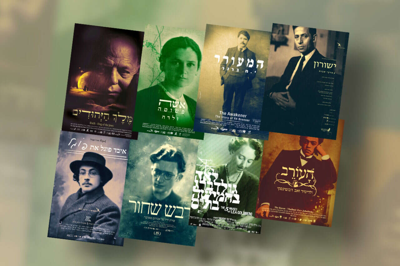 משמר תרבות ומאחה פערים. כרזות הסרטים: למעלה: אבות ישורון, י.ח ברנר, זלדה וביאליק למטה: ז'בוטינסקי, גולדברג, סוצקבר ופוגל // צילום: באדיבות העברים // משמר תרבות ומאחה פערים. כרזות הסרטים: למעלה: אבות ישורון, י.ח ברנר, זלדה וביאליק למטה: ז'בוטינסקי, גולדברג, סוצקבר ופוגל