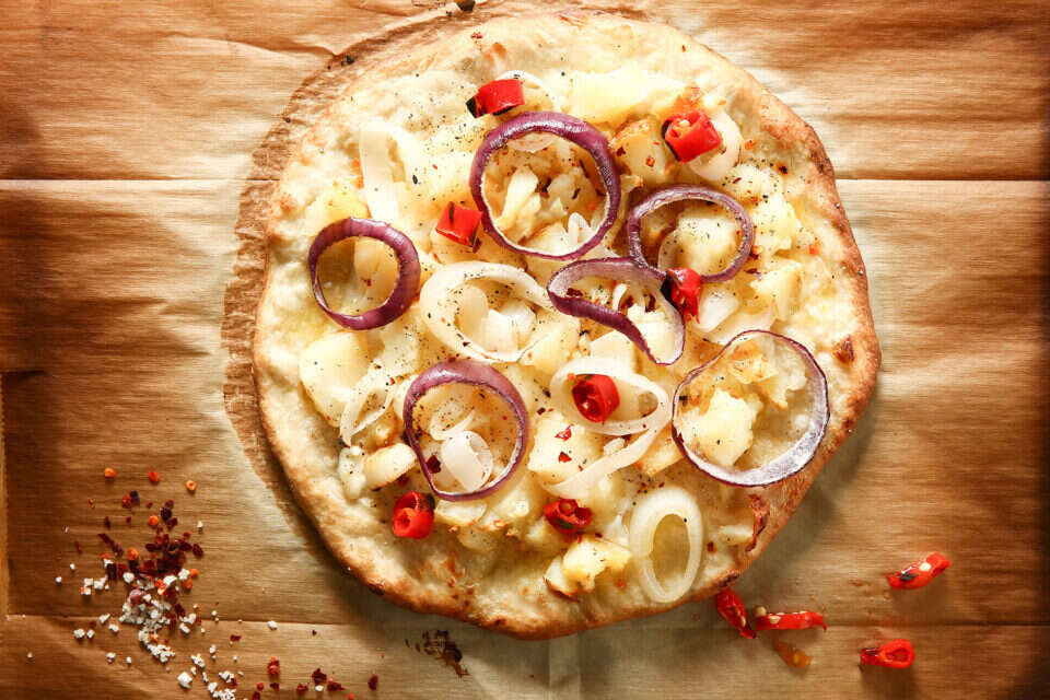 מערבבים את הריקוטה, המסקרפונה והפרמזן ומורחים על ארבע הפיצות. מפזרים מעל קוביות תפוחי אדמה ופרוסות בצל וצ'ילי. מתבלים במלח ובפלפל.