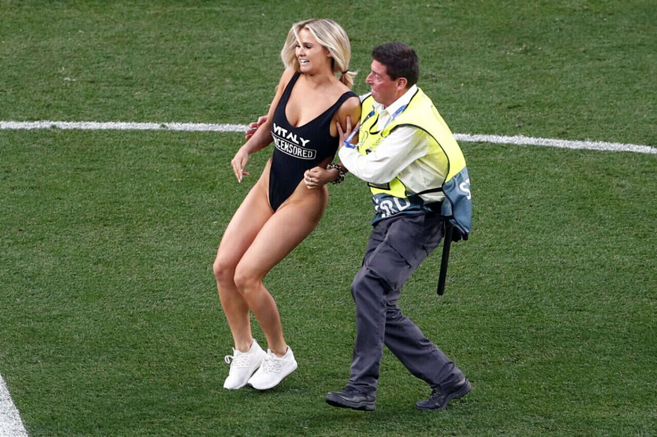 כזכור, אחרי 20 דקות בגמר במדריד, הבלונדינית החליטה לחדור למגרש ולהתרוצץ על הדשא כשהיא לבושה בבגד ים שחור בוהק, חשוף במיוחד שלא משאיר מקום לדימיון. אחרי מספר שניות, המאבטחים במגרש התעשתו ועצרו את הדוגמנית כשהגיעה כבר לאזור קו האמצע.