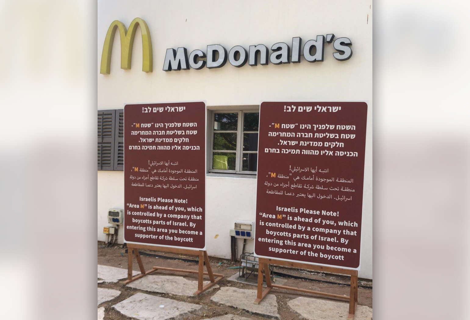 שלטים חריפים נגד הרשת מקדונלד'ס נתלו הבוקר (שלישי) בתל אביב ליד הסניפים, בהם נכתב: "שטח M - שטח בשליטת חברה המחרימה חלקים ממדינת ישראל, הכניסה אליו מהווה תמיכה בחרם זה".