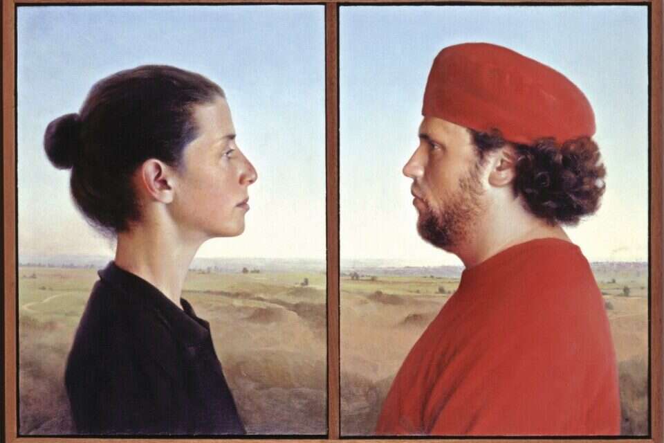 התערוכה נפתחת בקיר דיוקנאות עצמיים, חלקם רומזים אל מסורת הצייר המצייר (גם בהמשך המסע נראה זאת), והיא נחתמת בקיר ציורי טבע דומם של האמנים. בעבודות ניכרת ההתעקשות על אנטומיה, הידע האקדמי על צבעוניות, ההתבוננות הסיזיפית הסבלנית במודל, באובייקט, באור ובצל, בטקסטורה. אנו מתוודעים לאותם מוטיבים "אנטי־מודרניסטיים": פָּלֵטָה (פְּתֵכָה בעברית), קו, מרחב, אור, קומפוזיציה.