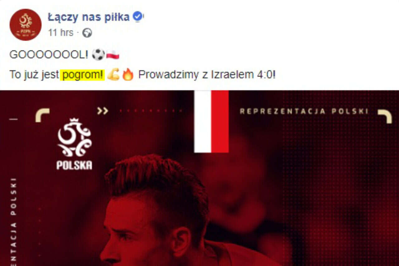 הניצחון על נבחרת ישראל אמש (שני) בתוצאה 0:4 עורר התלהבות רבה, אולי רבה מדי, בקרב אנשי התאחדות הכדורגל של פולין. לאחר השער הרביעי לרשתה של ישראל העלו בעמוד הפייסבוק של ההתאחדות הפולנית פוסט מקומם שבו נכתב "זה כבר פוגרום!"