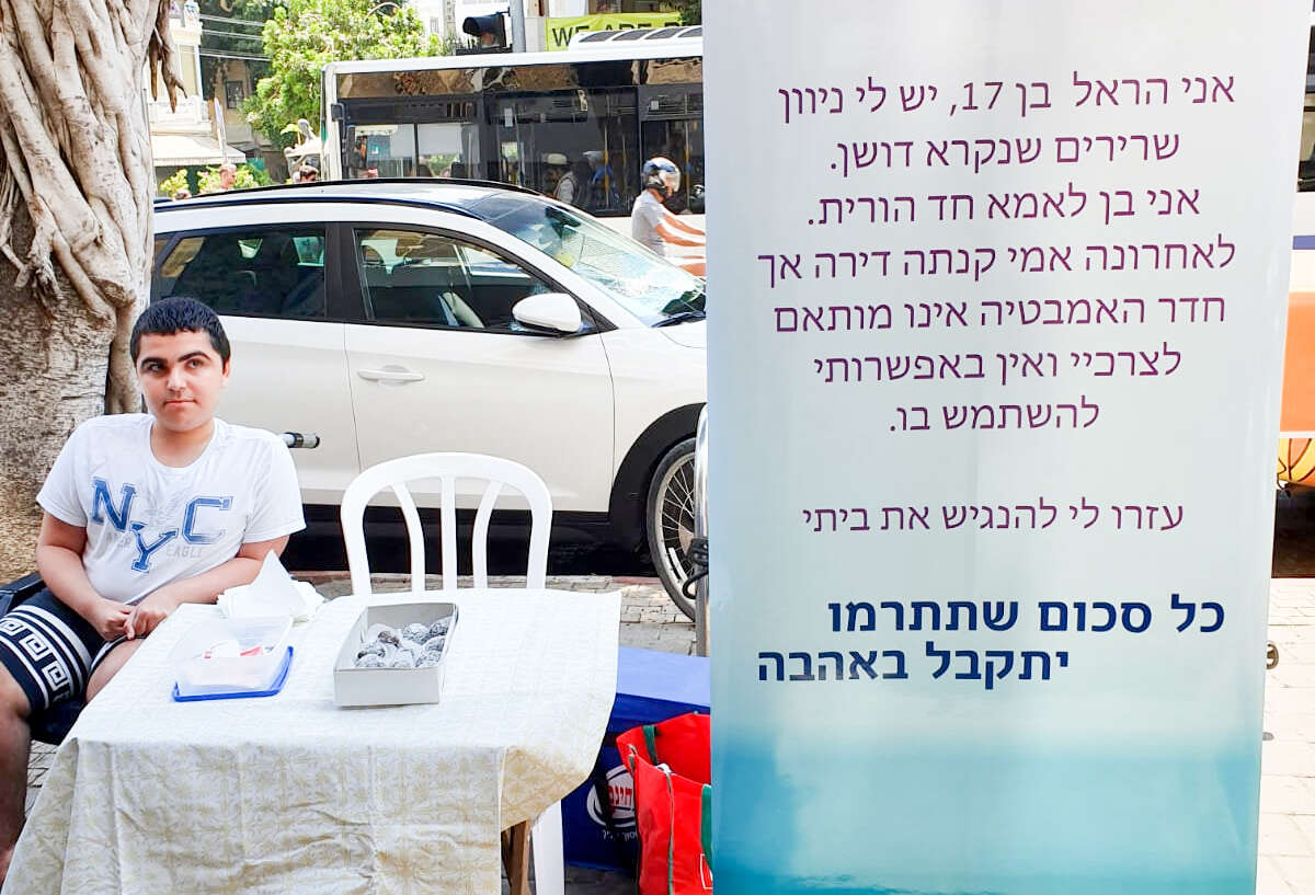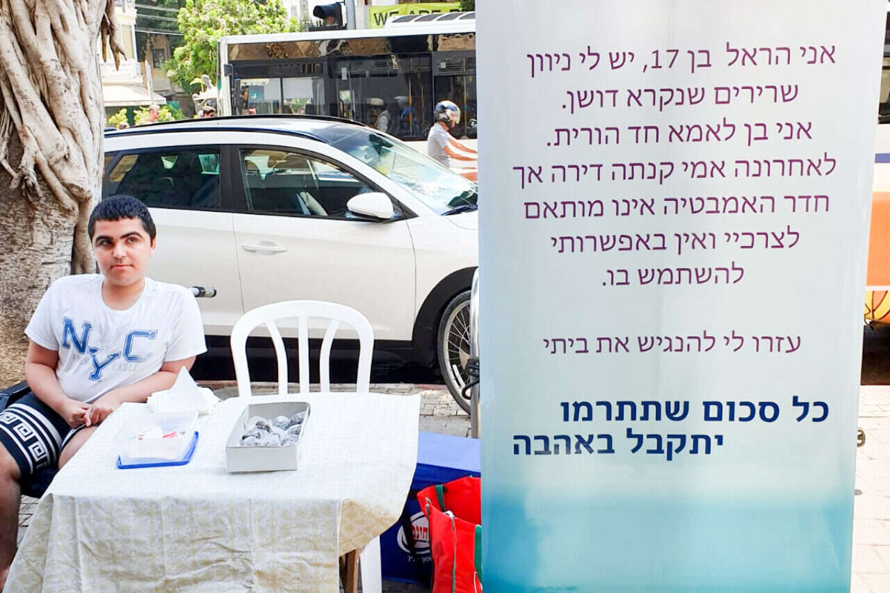 השלט שהציב לצידו הראל עזרא מספר את סיפורו. "אני הראל בן 17, יש לי ניוון שרירים שנקרא דושן. אני בן לאמא חד־הורית", כתב על עצמו והסביר: "לאחרונה אמי קנתה דירה, אך חדר האמבטיה אינו מותאם לצרכיי ואין באפשרותי להשתמש בו. עזרו לי להנגיש את ביתי. כל סכום שתתרמו יתקבל באהבה".