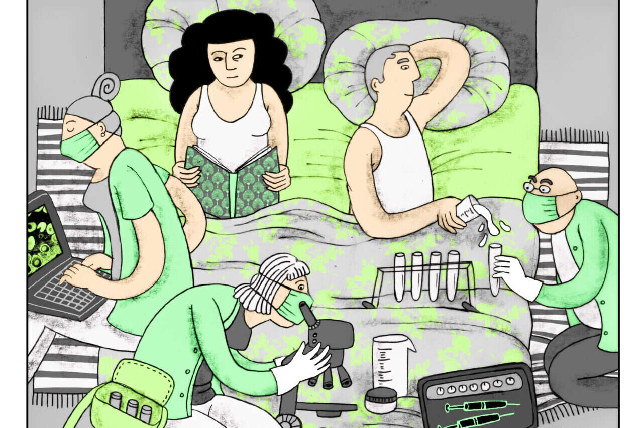 הפנטזיה שיניחו לה מתעצמת בניסיונותיה להיכנס להיריון ובטיפולי הפוריות שהיא עוברת. ההגזמה הקומית מיטיבה עם האיורים של עריף, שהולכים והופכים משעשעים יותר ככל שהיא פוגשת בעוד בעלי מקצוע מטעם עצמם המבטיחים לה שטיפול אצלם יביא את בשורת הפוריות - הררי המידע באינטרנט, הרפלקסולוגית הסובייטית, המומחה לדיקור מצפת, ההמלצה על אכילת שלוש ביצים רכות בכל בוקר - כל אלה הם לחם וחמאה של כל מאייר, ועריף משתמשת בהומור כדי לבכות את הפקעת הגוף, פריטתו לבדיקות טכניות ופולשניות, תוך שימוש בצבעי ירוק בהיר עכור, שמזכירים בתי חולים.