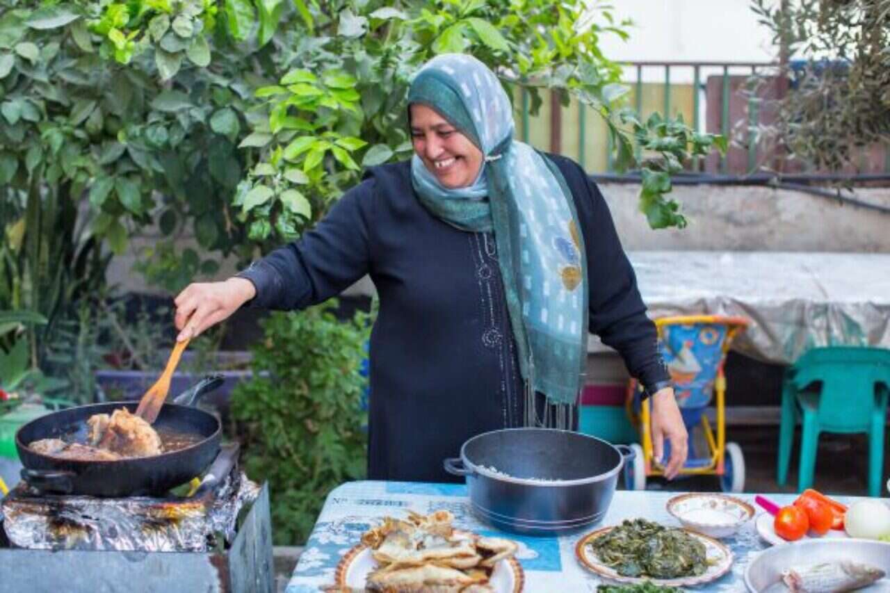היא מכינה סיאדייה - אורז ודגים ליום חג וימים טובים - מלברק שנקנה בבריכות של מעגן מיכאל, "כי היום הטבע לא נתן ים", היא אומרת שעה שהיא מניחה את הדגים בשמן הרותח, שמייד מתחיל לנגן לכבודם. אחרי שהשחימו תיקח מהשמן הזה לטגן בו ערימת בצל, שבו יתבשל אורז שחום משגע, מתובל באיפוק גדול. וכשהיא מפגישה בין דגים לאורז, היא זורית שקדים מטוגנים, "באוכל מתבשל אף פעם לא שמים שקדים חיים. זה לא טעים".