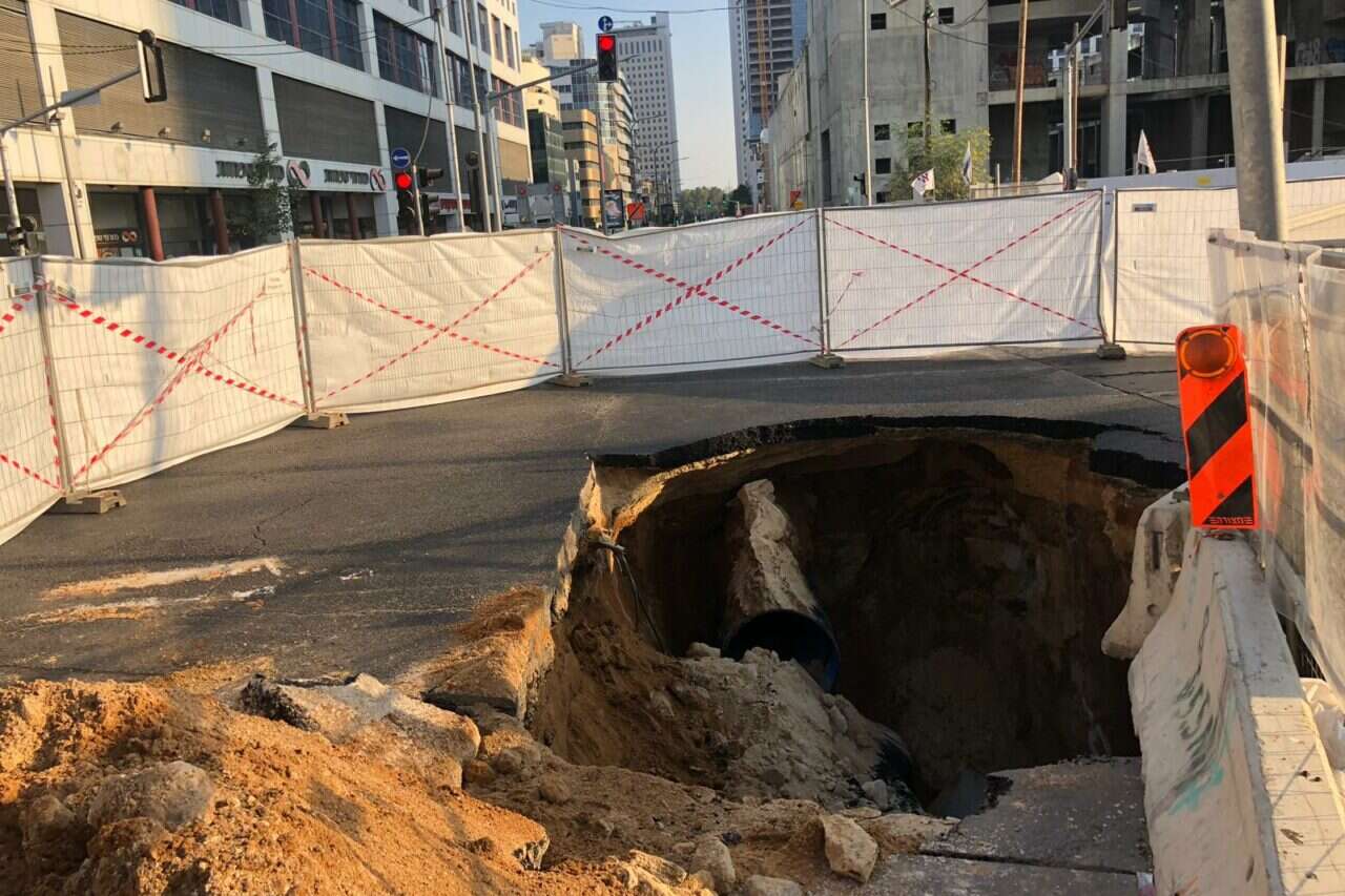 בור בקוטר 4 מטרים נפער בציר התנועה, והפך את אזור המרכז לסיוט תחבורתי • עובדי עירייה הזרימו בטון לקירות הבור על מנת למנוע את קריסת הכביש