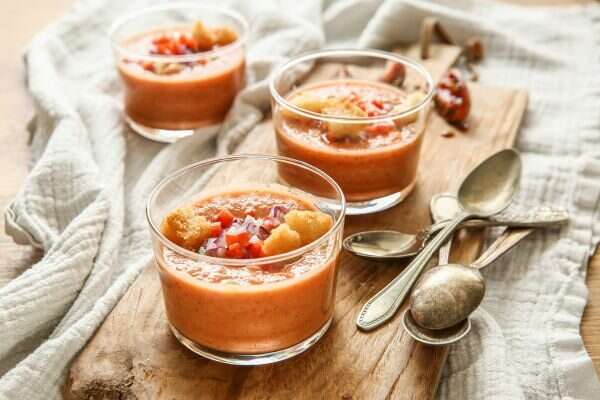 3. מוזגים את המרק לכוסות הגשה ומקשטים בקוביות צבעוניות של ירקות טריים ובקרוטונים.