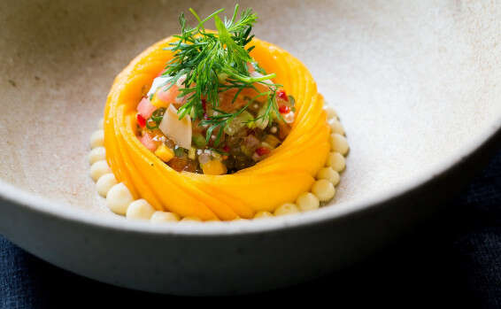 סלט המוגש כקוקטייל, עוף עם סטיקי רייס, וסביצ'ה דג מפוצץ בטעמים. מאיר אדוני משתעשע במנגו, וזה טעים כמו שזה נשמע