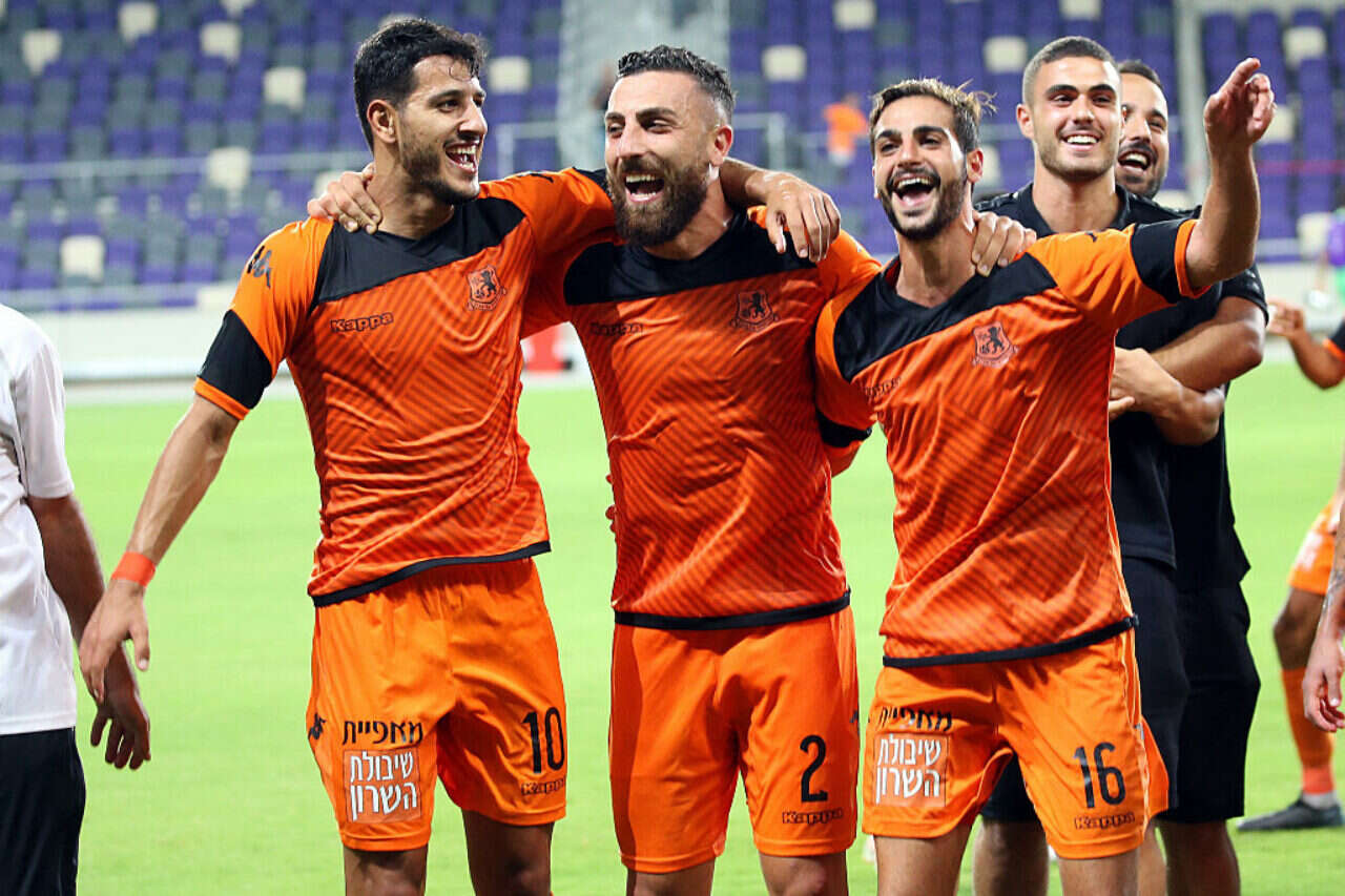 שחקני ק"ש חוגגים עם שרידן את שער היתרון, הערב בבלומפילד // צילום: אודי ציטיאט
