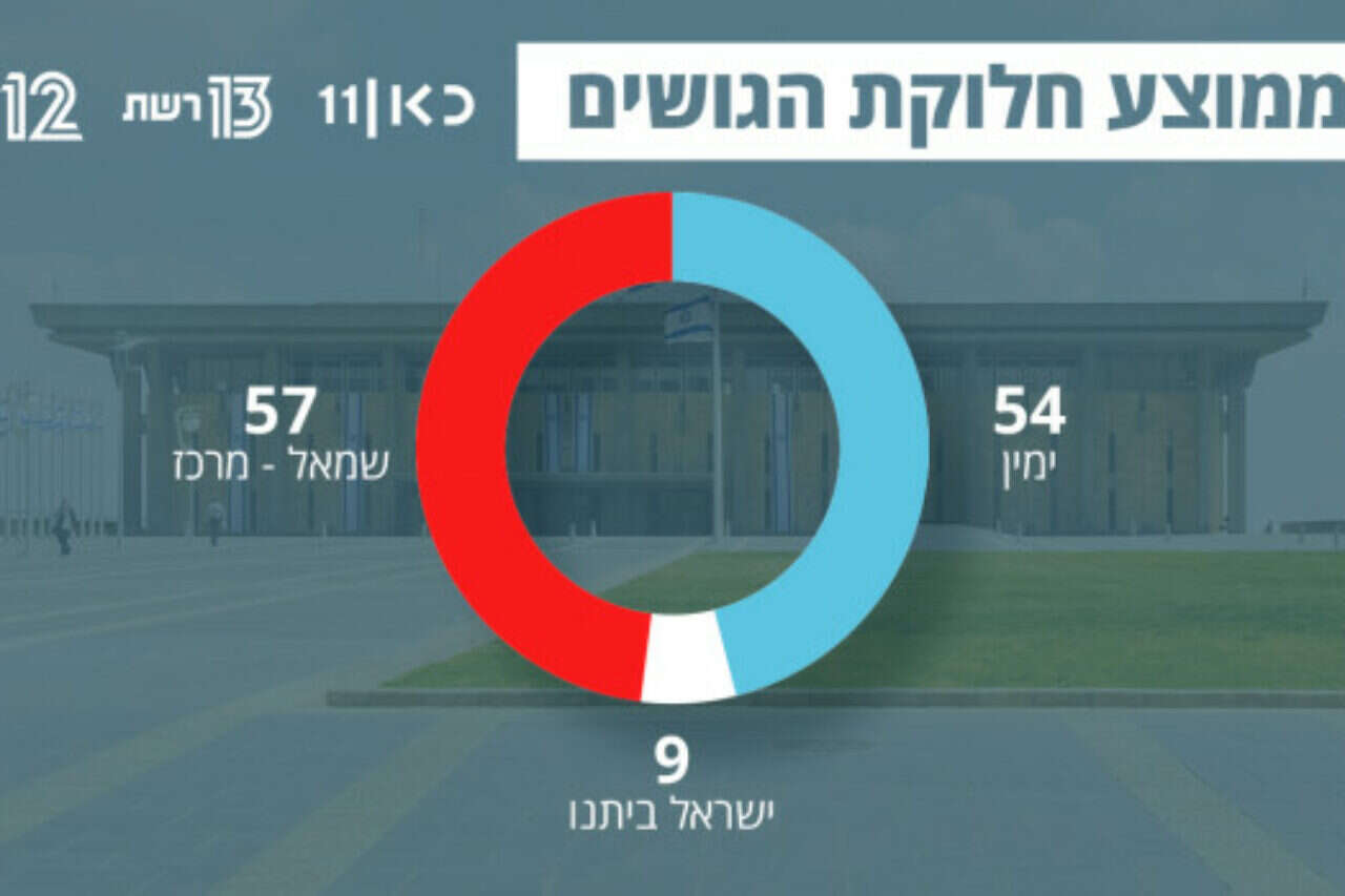 ההצבעה הסתיימה - אך עדייין אין הכרעה: על פי תוצאות המדגמים של שלושת ערוצי הטלוויזיה, אף אחד משני הגושים לא הצליח להשיג 61 מנדטים. מדגם חדשות 12 העניק לגוש הימין 57 מנדטים לעומת 55 לשמאל ושמונה לליברמן; מדגם חדשות 13 מנבא 53 מנדטים לגוש הימין לעומת 59 לשמאל ו-8 לליברמן; ומדגם כאן 11 חוזה 56 מנדטים לימין, 54 לשמאל ו-10 לליברמן.