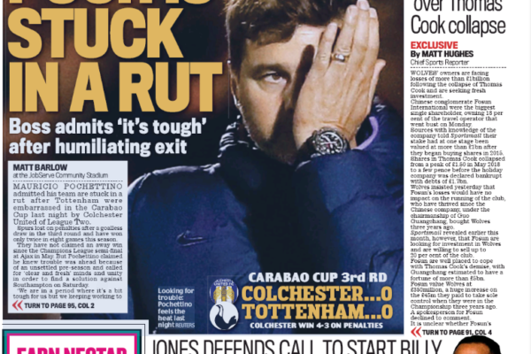 באנגליה מנסים להבין מה עובר על על טוטנהאם, שהודחה אמש (שלישי) מהגביע האנגלי בסיומו של דו-קרב פנדלים מול קולצ'סטר מהליגה הרביעית באנגליה! זאת אחרי שכריסטיאן אריקסן ולוקאס מורה החמיצו פנדלים מכריעים (0:0 בסיום 120 הדקות).