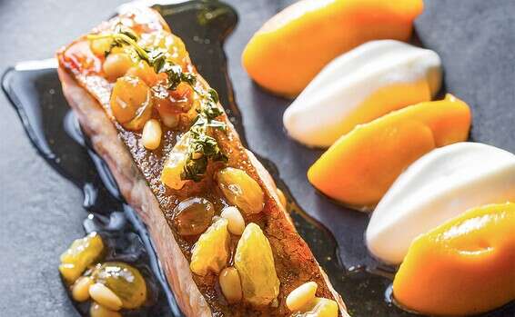 לצד הסלמון בחרתי להגיש פירה בטטה קל ופשוט. את כל אלה אני משלב עם רוטב מתקתק־חמצמץ של צימוקים רכים ומלאי מיץ, ובהגשה אני מניח מעט יוגורט, פרחי שומר וצנוברים. עוד דרך לעבוד עם דבש ולייצר חיבורי טעם נכונים ומאוזנים באמצעותו.