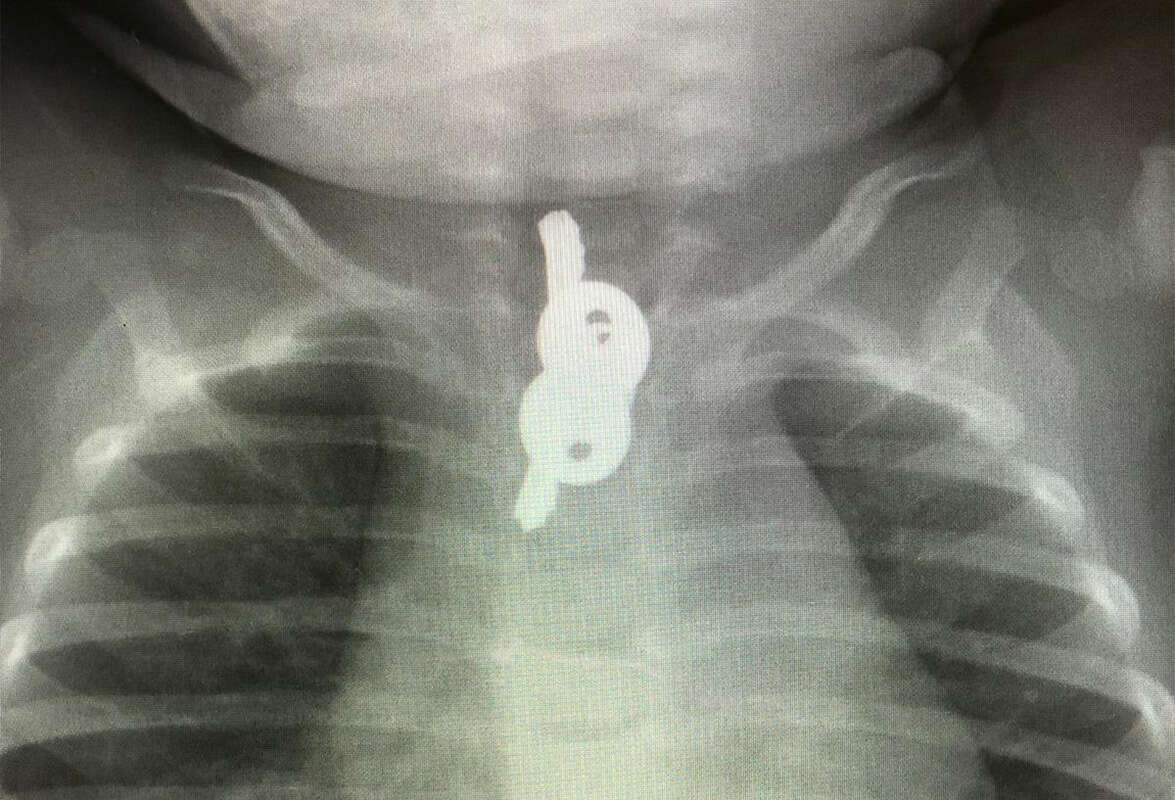 לאחר שהחום שפיתח התינוק עלה שוב, החליטו ההורים לפנות למרפאת "טרם", שם בוצע צילום חזה בחשד לדלקת ריאות. ממצאי הצילום השאירו את ההורים והרופאים המומים: בוושט התינוק התגלו זוג מפתחות, שככל הנראה בלע כמה ימים קודם לכן.