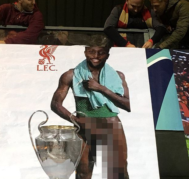 עוד לפני שריקת הפתיחה, אוהדי ליברפול, שהתמקמו ביציעים הניפו שלט של חלוצם הבלגי, דיבוק אירוגי, כשהוא עירום ועם איבר מין גדול מהרגיל. לצד התמונה נראה גם גביע האלופות. מיותר לציין שהבוקר (חמישי) השלט הפוגעני עורר סערה בממלכה, שם הבינו כי האוהדים האנגלים שוב חצו קו אדום עם התייחסות מיותרת לגודל איבר המין של שחקנים כהי עור.