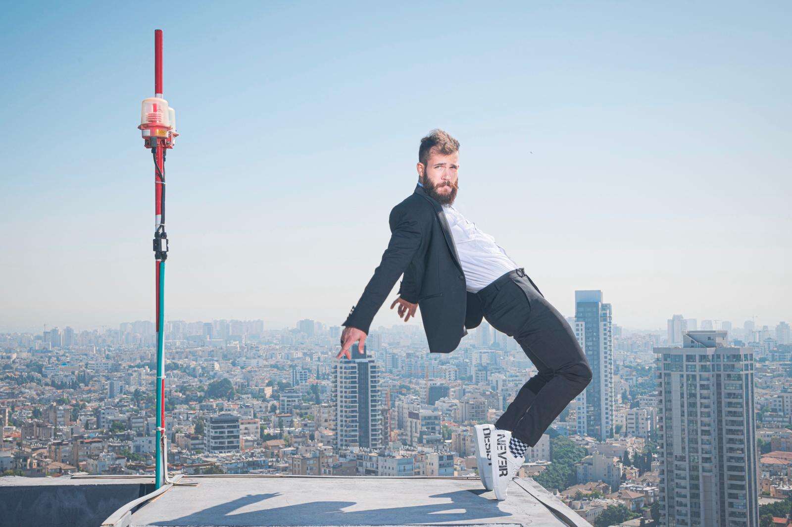 צולם על גג בניין ברמת גן; ע.צלם: שרון אטיאס; סטיילינג: מעיין ל־HOUSE OF STYLE, חליפה: NAMES, נעליים: ZARA