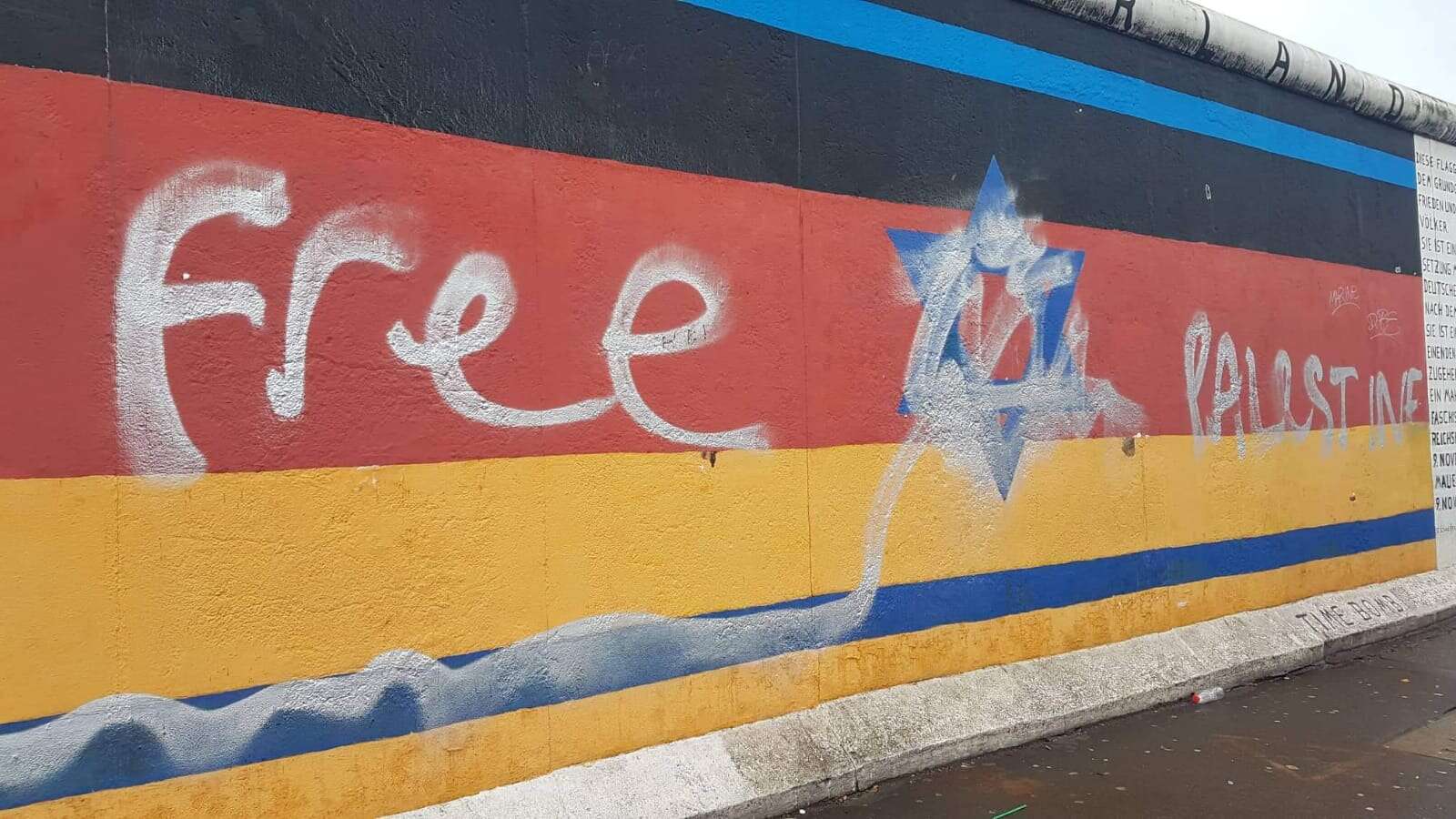 לפני כמה ימים הושחת הקיר ולא בפעם הראשונה. על הקיר נכתב "free palestine" וכפי שניתן לראות בתמונה, מגן הדוד נמחק וכך גם חלק מהקו הכחול התחתון של דגל ישראל. "בביקורי בעיר ברלין השבוע ובחומת ברלין, אתר אשר מסמל חופש אני נתקל בזה, פשוט הייתי בהלם וחשתי זעזוע רב, תחושת אי-נעימות ועזבתי את המקום כמה שיותר מהר", סיפר ל"ישראל היום" נדב שוקרון שצילם את הקיר. לדבריו, "חשוב לציין שהאווירה בברלין ואני יכול להעיד רק על עצמי כמובן, לא כל כך נעימה".