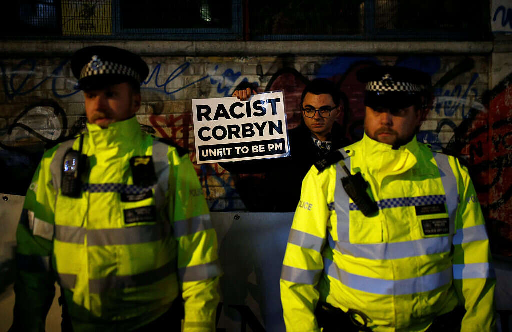 קבוצה קטנה של כ-20 פעילים יהודים ולא יהודים העזה אמש להתייצב סמוך לכניסה לאולם, בו עמד ג׳רמי קורבין לשאת את נאומו האחרון במערכת הבחירות שעשויה או עלולה להכריע את גורלו הפוליטי ואת גורלה של בריטניה. בניגוד למאות תומכיו המשולהבים של מנהיג הלייבור, שהמתינו לקורבין במשך שעות מחוץ לאולם, בליל חורף מקפיא, נשאו חברי הקבוצה הקונה כרזות עם מסר מאוד לא מחמיא לכוכב הערב: ״קורבין גזען״, נכתב עליהן. על שלט לבן גדול מימדים, אותו פרשו חברי הקבוצה כמגן בינם לבין אוהדיו של קורבין, נכתב: ״יהודי בריטניה אומרים לא, לעולם לא לקורבין״.