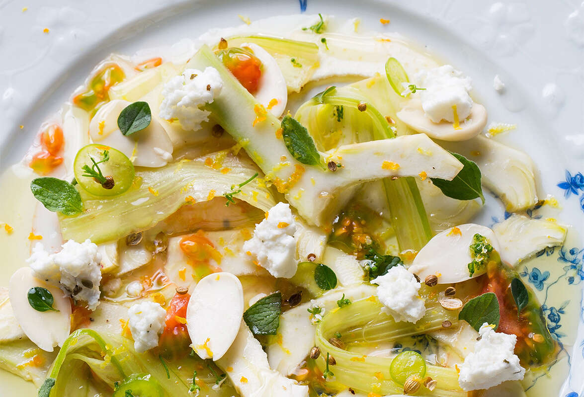 החיבור בין הפרח לגבעוליו מרתק בעיניי. הטעם העדין והמתקתק כמעט של הלב ומרירות הגבעולים (החרשוף) יוצרים ריגוש מורכב בחך. אני בכלל חושב שהטעם המר באוכל הוא המסקרן והחכם מבין כל הטעמים, ולכן יצרתי פה מפגש בין טעמי הארטישוק לחרשוף. המיץ וגרידת הלימון, מלח הים, מיצי העגבנייה, שמן הזית, עשבי התיבול הירוקים והגבינה המלוחה משלימים את המנה ומחזירים אלי את סבתא לכמה רגעים מרגשים.