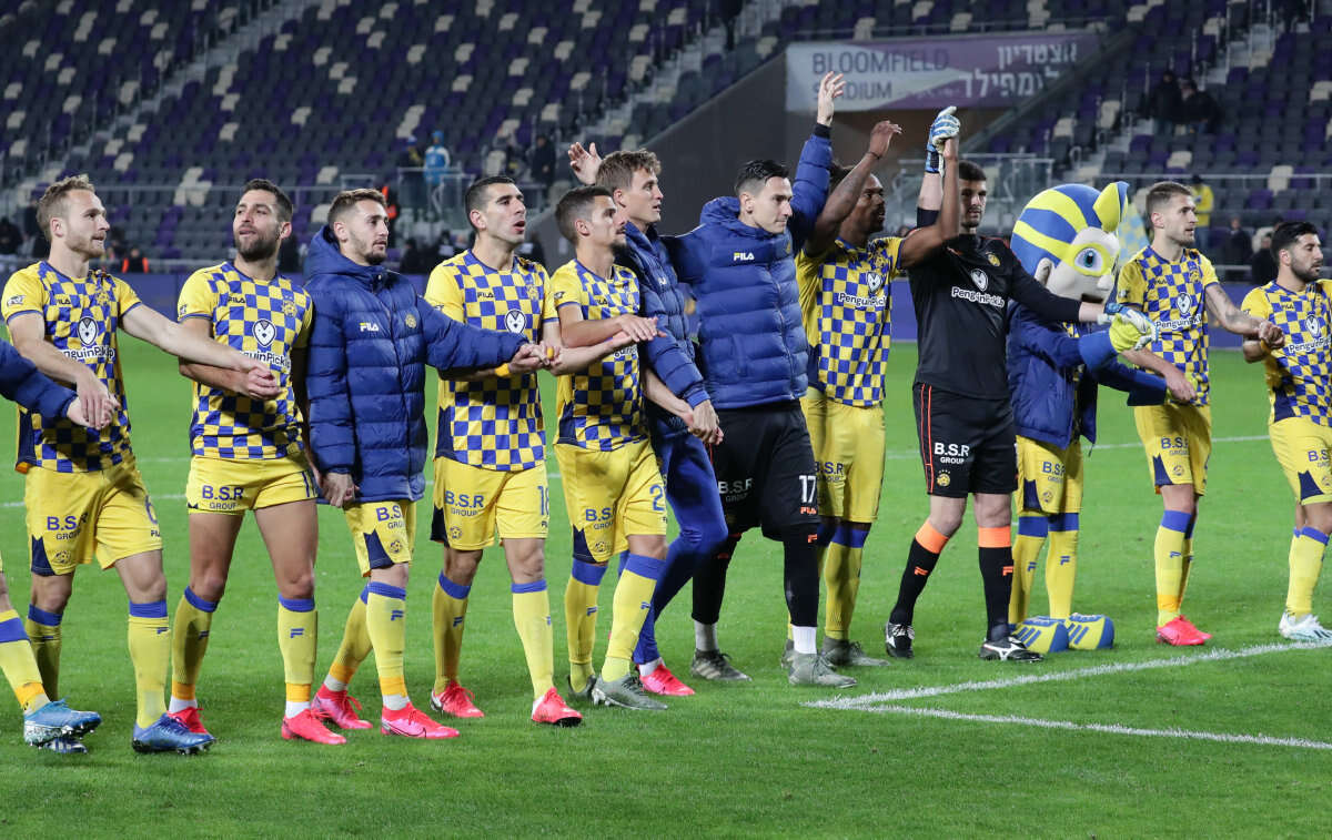 הצהובים חוגגים עם יונתן כהן את ה-0:2, אתמול ביפו // צילום: דני מרון