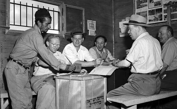 בכובע טמבל. מצביעים וחברי ועדת הבחירות בקיבוץ מעלה החמישה ביום הבחירות לכנסת ה־4 (1959) // צילום: פריץ כהן, לע"מ