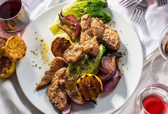 שקדי עגל סו־וויד עם סלט רענן. צורבים את החסה בגריל ומתבלים בשמן זית ובלימון // צילום: איתיאל ציון