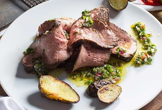 רוסטביף סינטה סו־וויד עם בייבי תפוחי אדמה מדורה. רוטב הצ'ימיצ'ורי מעקצץ // צילום: איתיאל ציון