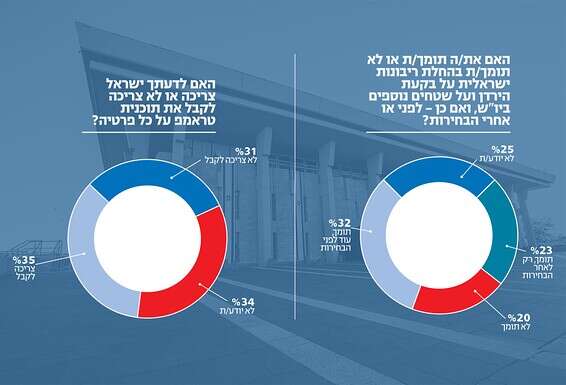 לגבי תוכנית טראמפ, דעותיו של הציבור חצויות. לשאלה האם ישראל צריכה לאמץ את התוכנית כולה, 35% השיבו בחיוב. 31% אמרו שלא. 34% אמרו כי הם לא יודעים.
