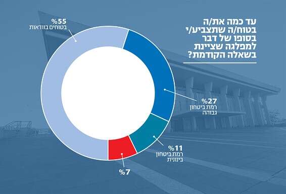 ומה לגבי שיעור הביטחון במימוש זכות ההצבעה? גם כאן מובילה יהדות התורה עם 83% מבוחריה, שאמרו שיבואו לממש את זכותם בוודאות. הליכוד עם 60% ודאות ואילו כחול לבן עם 66% ודאות. המפלגה עם שיעור הוודאות הנמוך ביותר היא ישראל ביתנו. רק שליש מבוחריה אמרו שיגיעו בוודאות לקלפי לממש את זכותם.