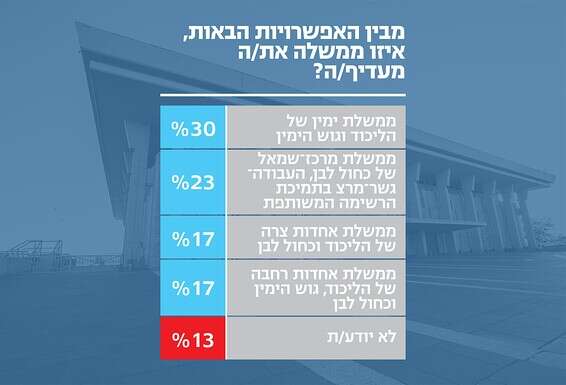 מהסקר עולה כי לו הבחירות היו נערכות היום, היתה כחול לבן שומרת על מעמדה כמפלגה הגדולה ביותר בכנסת, ואף עולה ל־36 מנדטים - שלושה יותר ממה שיש לה בכנסת הנוכחית. הליכוד נותר שני עם 34 מנדטים (לעומת 32 בפועל).