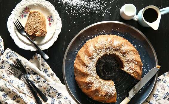 מערבבים אבקת סוכר, מים וקפה לעיסה סמיכה, מטפטפים כזיגוג מעל העוגה ומפזרים קוקוס טחון.
