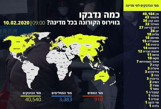 בתוך כך, סין דיווחה היום על עליה במספר הנדבקים בוירוס ביממה החולפת, זאת לאחר שאתמול נרשמה לראשונה ירידה בקצב ההדבקה בווירוס הקורונה הקטלני.