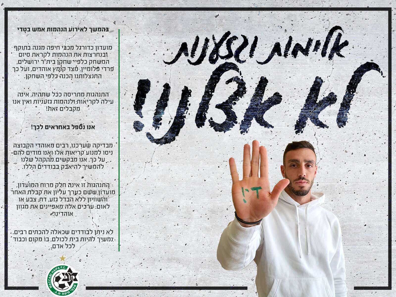 במכבי חיפה הבינו שהעניין לא יעבור בשתיקה והחליטו להוציא הודעת מועדון תחת הכותרת "אלימות וגזענות לא אצלנו". בהודעה נכתב: "בהמשך לאירוע הנהמות אמש בטדי, מכבי חיפה מגנה בתוקף ובנחרצות את הנהמות לקראת סיום המשחק כלפי שחקן בית"ר ירושלים, פרדי פלומין, מצד קומץ אוהדים, ועל כך התנצלותנו הכנה כלפי השחקן. התנהגות מתריסה ככל שתהיה, אינה עילה לקריאות ולנהמות גזעניות ואין אנו מקבלים זאת. אנו נטפל באחראים לכך.