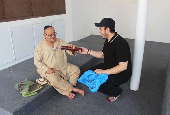 אנחנו מתפללים יחד תפילת מנחה, ואז מצטלמים. בדיוק כשאני מתכונן להסיר את התפילין, שניים מחבריו מציצים מהחלון בסקרנות. לא נראה לי שמפריע להם שאנחנו מתפללים.