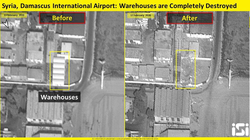 דוח מודיעין של חברת אימג'סאט אינטרנשיונל (ImageSat International - ISI), חברת הלוויינים ופיתרונות המודיעין, חושף צילומי לוויין של האתר בסוריה שעל פי דיווחים זרים הופצץ בחמישי בלילה על ידי ישראל. בצילומי הלווין נראה נזק רב למחסנים באזור נמל התעופה הבינלאומי של דמשק שהסורים מחכירים לאיראנים, כשבתמונות מוצג האתר לפני ואחרי התקיפה.