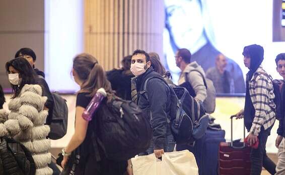 נוסעים בנתב"ג עם מסיכות בשל החשש מקורונה // צילום: גדעון מרקוביץ'