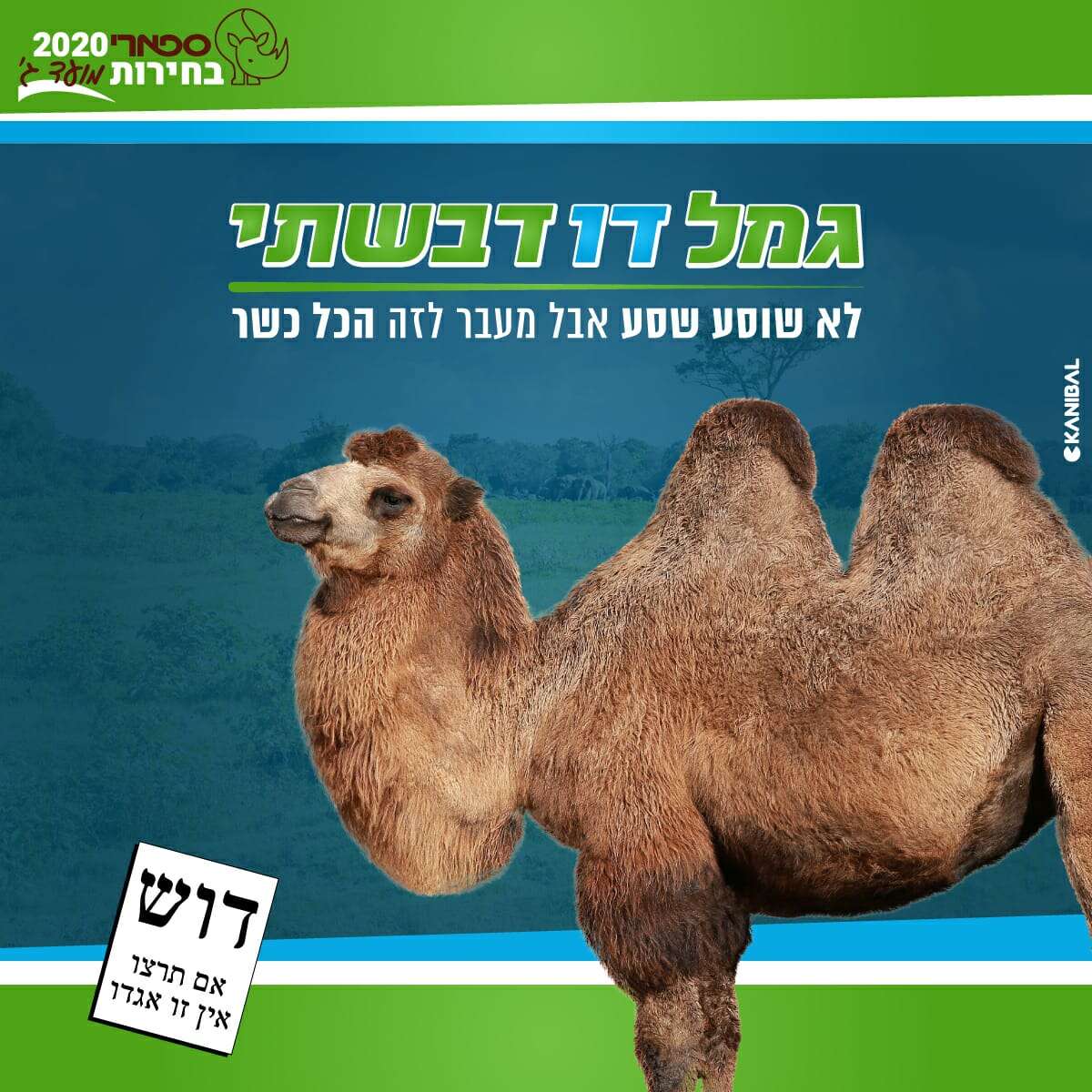 "אי אפשר לשכוח שמדובר במנהיג שרואה את הדבשת של עצמו", אומר הקמפיין של הגמל הדו-דבשתי. "הוא לא שוסע שסע ומלבד זאת, במערכת הבחירות שלו - כל השאר כשר". האותיות שלו הן "דוש" והוא מוסיף: "אם תרצו - אין זו אגדו".